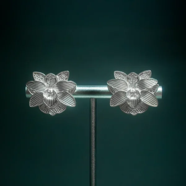 Pendientes de plata 950 inspirados en orquídeas amazónicas, con topacios blancos y detalles geométricos que fusionan arte, naturaleza y tradición.